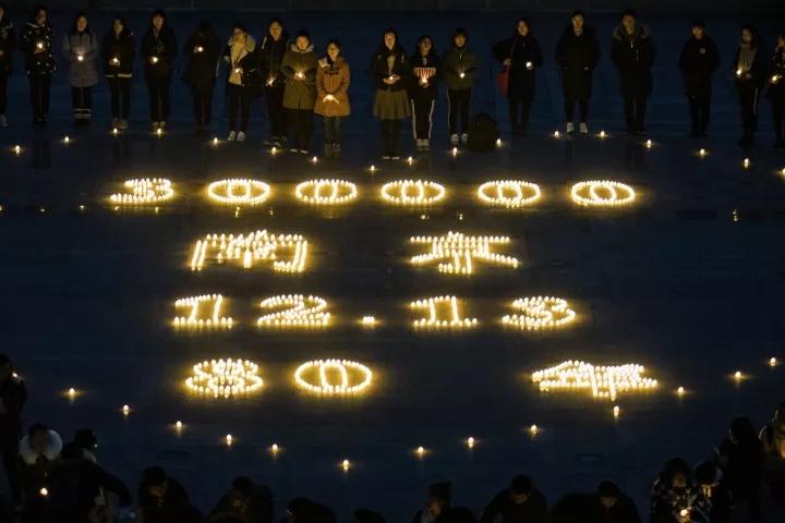 △2017年12月11日晚 南京大学生烛光祭奠30万遇难同胞 图/视觉中国
