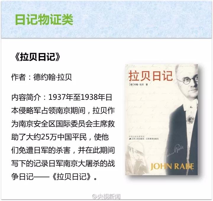 《世界记忆名录——南京大屠杀档案》《南京大屠杀史稿》《南京大屠杀图录》《南京大屠杀辞典》《南京大屠杀:第二次世界大战中被遗忘的大浩劫》《南京大屠杀》《南京大屠杀全纪实》《拉贝日记》《魏特琳日记》《东史郎日记》以及南京大屠杀公祭全民读本、德国外交官罗森的报告、贝茨文献等等