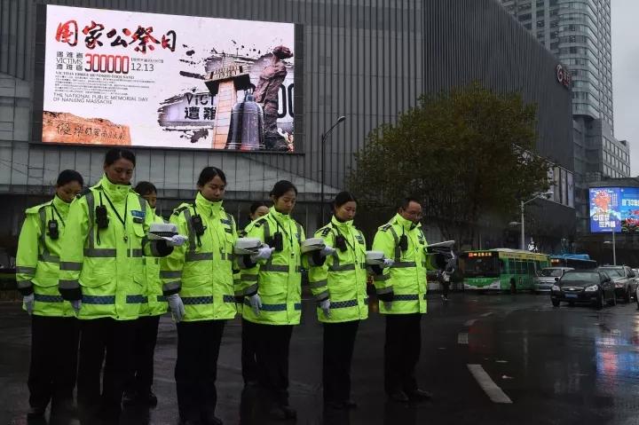 △2016年12月13日上午10时,南京上空警报再响,机动车停驶并鸣笛致哀。执勤的交通民警脱帽向南京大屠杀死难同胞默哀。图/视觉中国