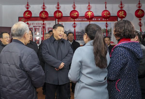 之后,习近平又来到附近的潘安湖街道马庄村考察。在村史馆,习近平看图片、看资料、看实物,肯定该村从单纯以煤为生转型到多种产业共同发展的经验,指出发展特色产业、特色经济是加快推进农业农村现代化的重要举措,要因地制宜抓好谋划和落实。在党员活动室,习近平走进正在学习党的十九大精神的党员中间,听他们谈学习体会,看他们的学习笔记,问他们感受最深的是什么、有什么意见和建议,希望他们在学习贯彻党的十九大精神中发挥积极作用。他指出,农村基层党组织是农村各个组织和各项工作的领导核心,要强化农村基层党组织职能,把农村基层党组织建设成为宣传党的主张、贯彻党的决定、领导基层治理、团结动员群众、推动改革发展的坚强战斗堡垒。