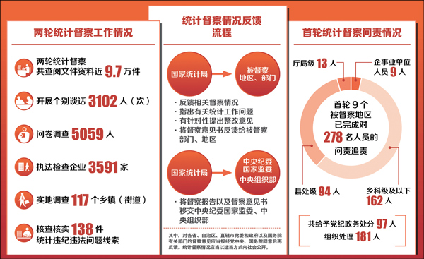 据了解,两轮统计督察共查阅文件资料近9.7万件,开展个别谈话3102人(次),问卷调查5059人,执法检查企业3591家,实地调查117个乡镇(街道),核查核实138件统计违纪违法问题线索。截至7月初,第二轮17个被督察地区、部门均已报送督察整改报告,并向社会公开整改情况。