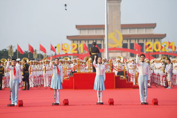在庆祝中国共产党成立100周年大会上,共青团员和少先队员代表集体致献词,致敬党的百年奋斗历程,发出“请党放心,强国有我”的时代强音。(图片来源:人民视觉)