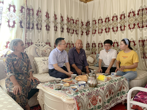 图为喀什地区纪委委员、监委委员,广东省纪委监委援疆干部郑杰(左二)在维族群众家中走访,了解其生产生活情况,推动解决“急难愁盼”问题。冯仲元 摄