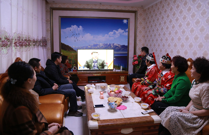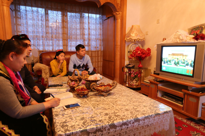 博湖县乌兰再格森乡乌图阿热勒村牧民党员才登家一家与博湖县纪检监察干部一起围坐在电视机前观看当天的新闻联播