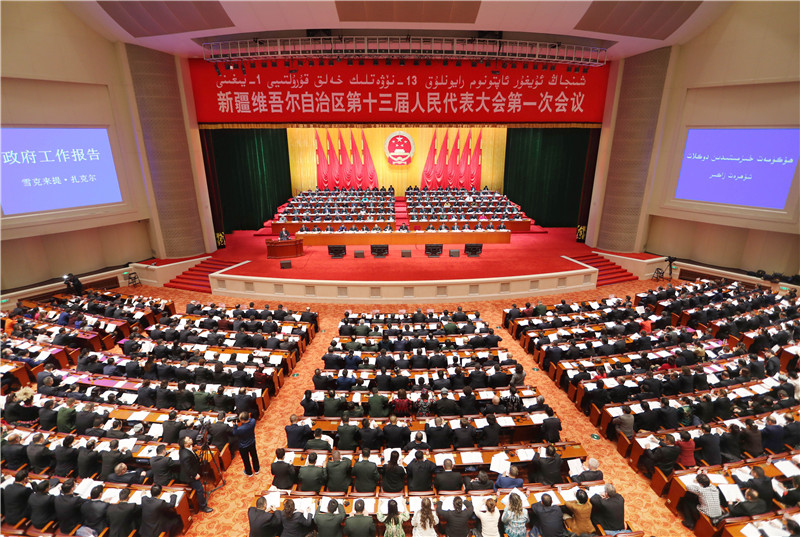 上午10时30分,开幕大会主持人王永明宣布:新疆维吾尔自治区第十三届人民代表大会第一次会议开幕。全体起立,高唱国歌。