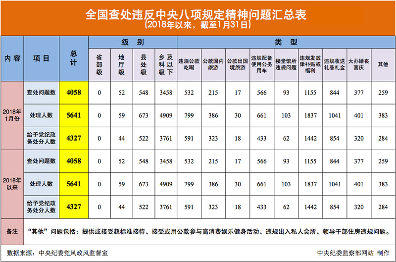 为掌握全国贯彻落实中央八项规定精神情况,中央纪委在31个省区市和新疆生产建设兵团、139个中央和国家机关、97个中央企业、15个中央金融企业等建立了落实中央八项规定精神情况月报制度。2018年以来,截至1月31日,全国查处违反中央八项规定精神问题情况如下: