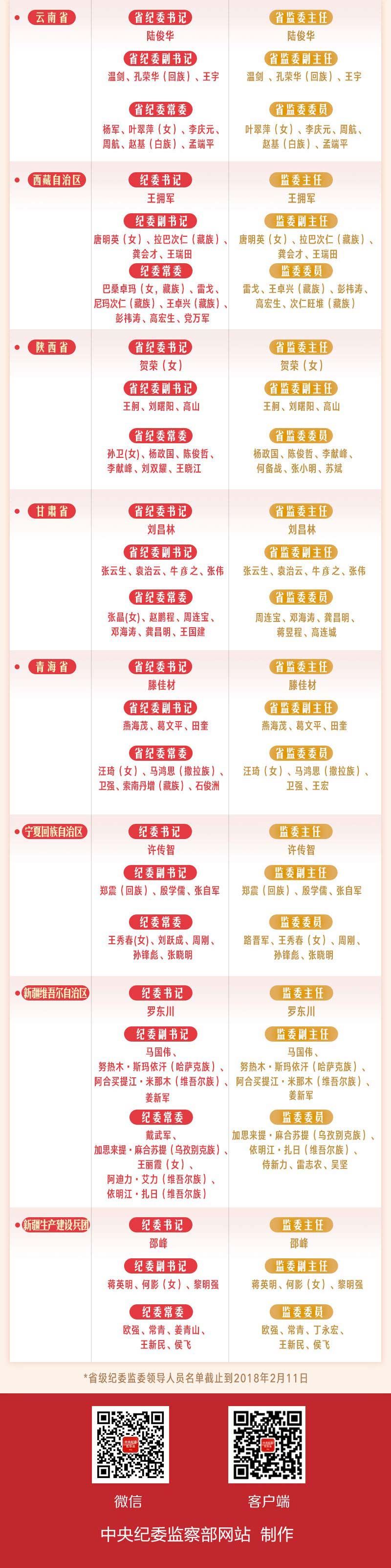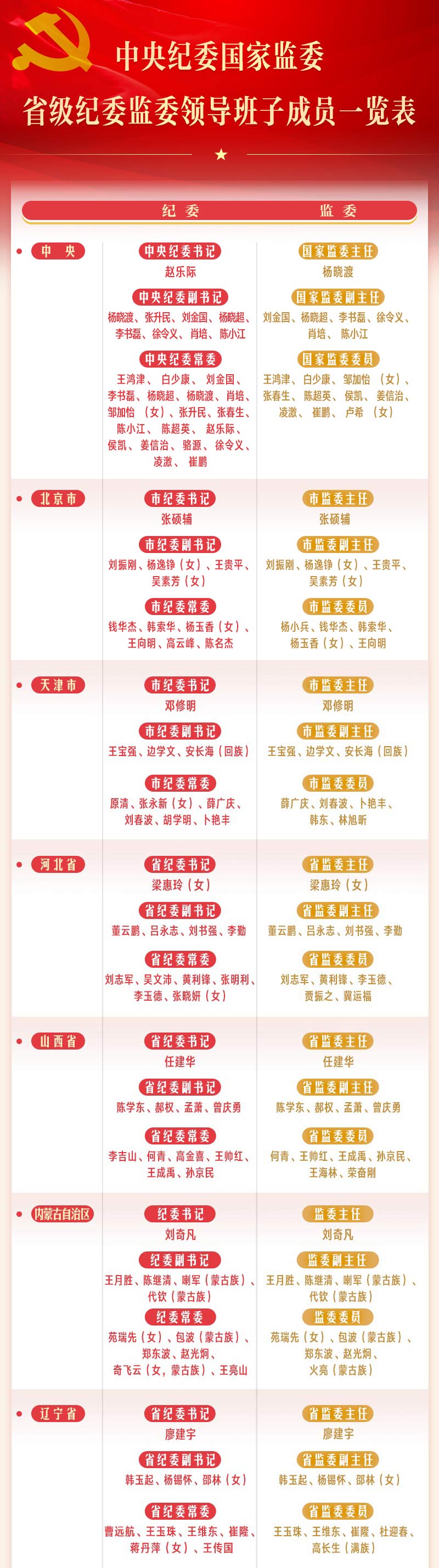 中央纪委国家监委省级纪委监委领导班子成员一览表