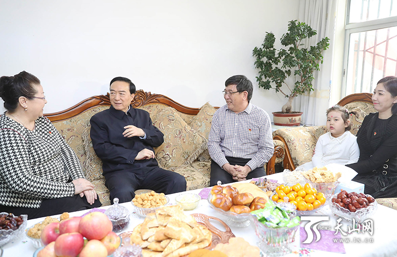 3月24日,自治区党委书记陈全国在阿勒泰地区调研。图为陈全国来到老党员阿依古丽 · 苏莱曼家中与一家人拉家常、问生活。新疆日报记者崔志坚摄