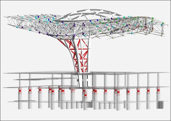 在航站楼的屋面网架施工阶段,面对大面积的网架、大规模组件、高难度支撑等难题,项目团队多次邀请钢结构专家进行论证,并用BIM技术进行模拟,最终确定了“分区施工、分区卸载、总体合龙”的原则。同时引入使用计算机控制液压同步提升技术、数字三维仿真模拟技术、测量机器人、三维扫描检测、三维空间坐标测量、超声波无损检测等先进技术和设备。仅用80天时间实现钢网架结构成功封顶,提升精度差控制在±1毫米以内,19万余米焊缝长度的现场焊缝探伤一次合格率达100%。