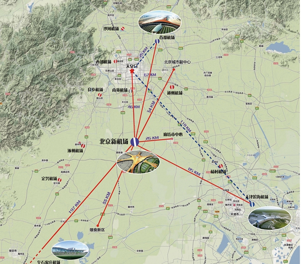以北京天安门为起点,沿中轴线向南46公里,便来到正在建设中的北京新机场。这座面向未来的机场,距首都机场67公里、天津滨海机场85公里、雄安新区55公里。
