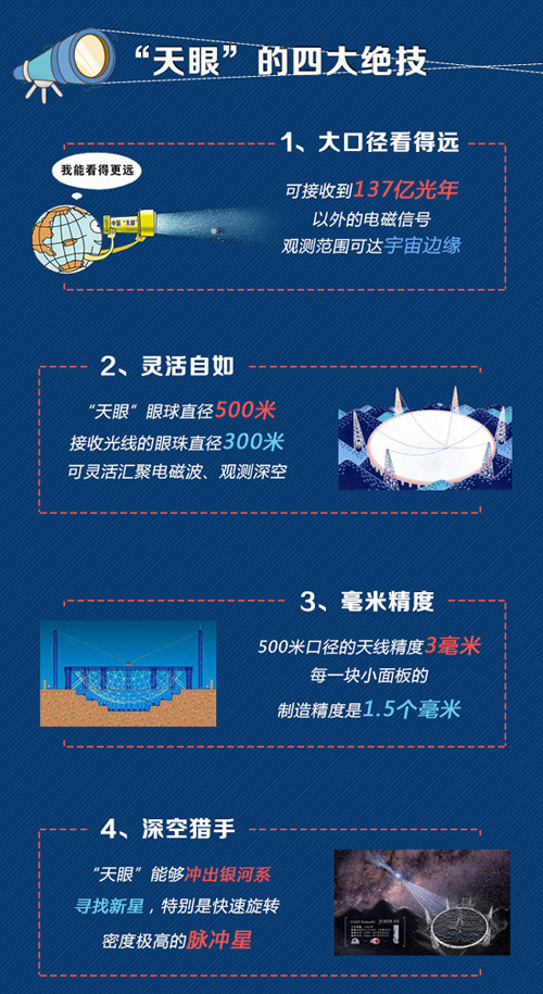 “可接收到137亿光年以外的电磁信号”“天空覆盖范围为天顶角40度”“跟踪精度8角秒”“观测换源时间小于10分钟”……一组数字反映了“天眼”的高超技能。