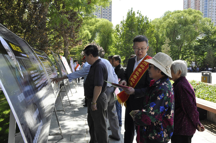 在库尔勒人民广场,青年党员干部驻足观看监察法宣传展板。