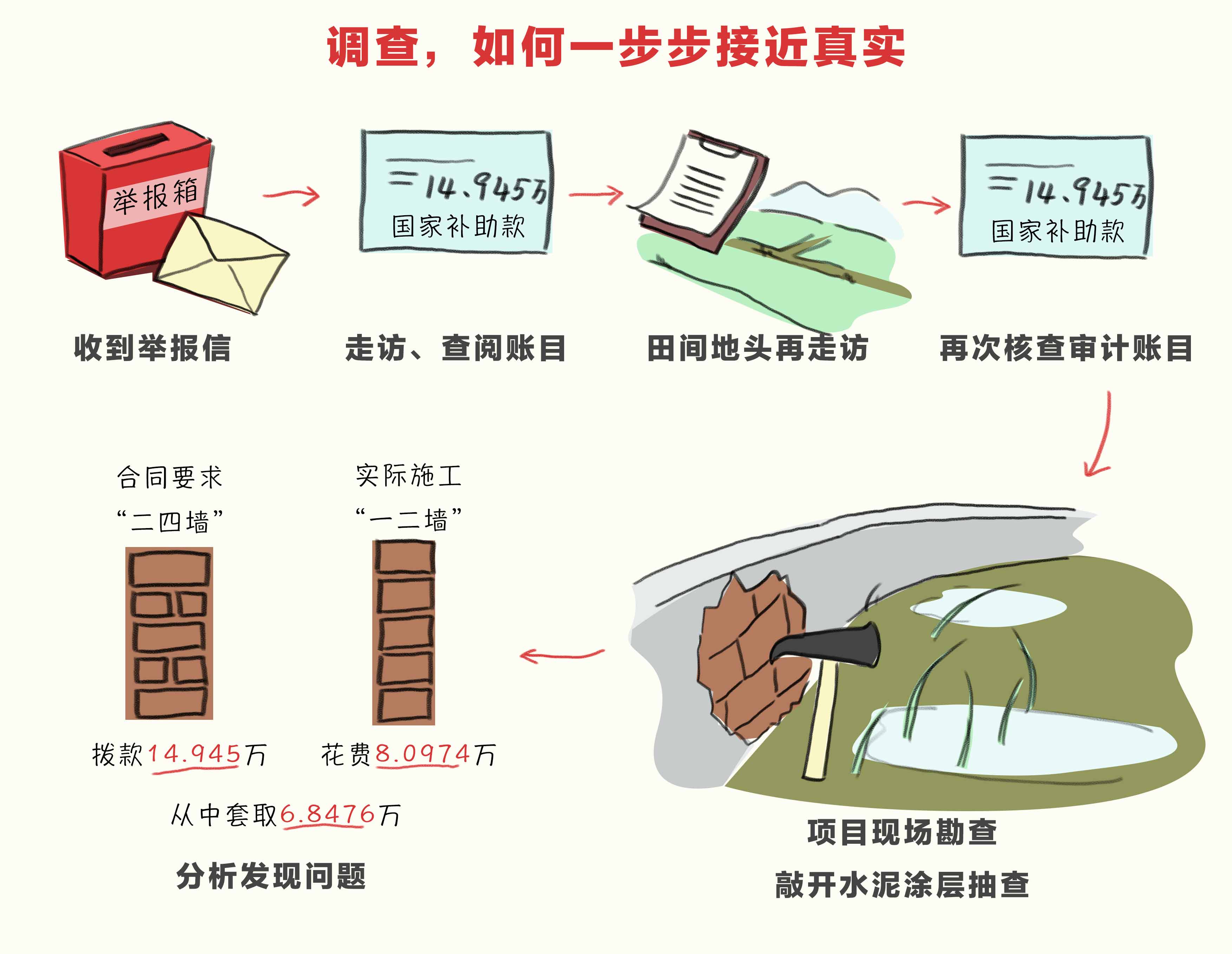 “既然群众有反映,那我们就要给出一个明白的交代!”面对无法直接核实的“难题”,调查组决定随机抽干两口改造后的山坪塘、敲开水泥涂层,一块块地把砖头数清楚,看看项目质量是不是扎实。很快,问题就浮出水面:工程合同要求的是“二四墙”,每平方米应该有128块砖左右,但改建的堵水田每平方米却只有62块砖,是“一二墙”的标准。偷工减料的工程款去了哪里?