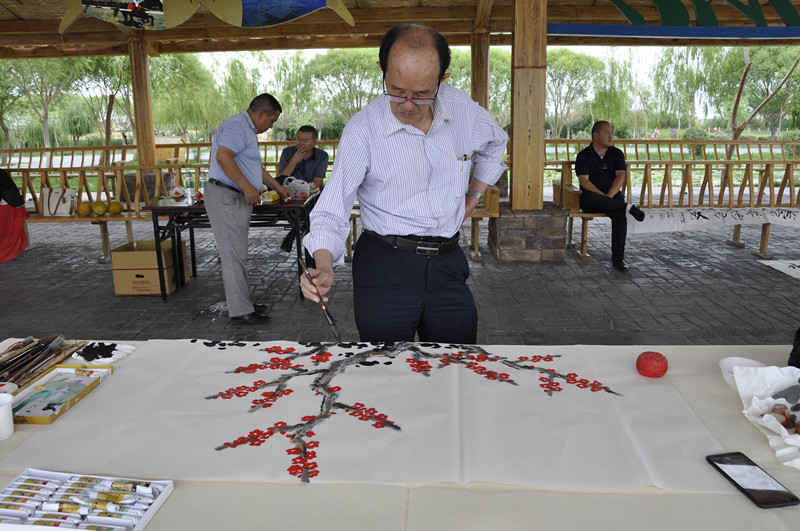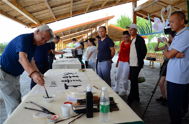 活动现场,新疆书法家协会名誉主席席时珞,新疆画院国家一级美术师龙清廉(阿龙),中国书法家协会理事、新疆书法家协会常务副主席李志顺,中国西部散文学会副主席、《新疆文艺界》杂志副主编孤岛,新疆书法家协会理事、乌鲁木齐书法家协会副主席张仁润,中国胡杨艺术研究院副院长、首都博物馆画院画家童宏琦在众多游客的围观下挥毫泼墨,短短几分钟的时间,一幅幅精美的作品便跃然纸上,引得游客驻足欣赏、一片赞叹。