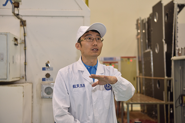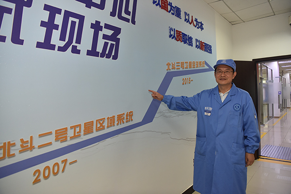航天科技集团五院北斗三号总体主任设计师刘家兴在卫星总装车间。(裴英 摄)