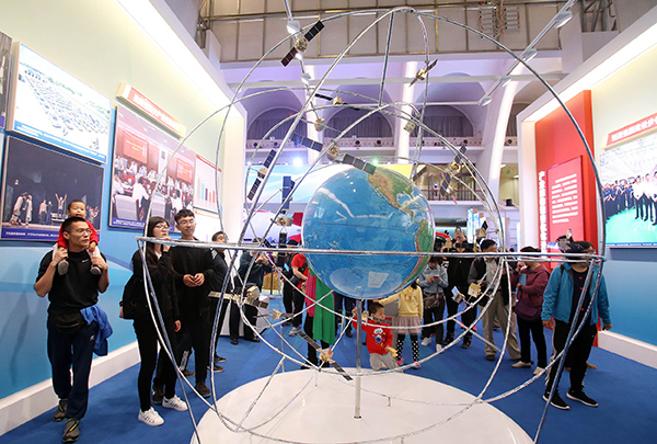 参观者在北京举行的“砥砺奋进的五年”大型成就展上观看“北斗卫星导航全球组网星座系统模型”。