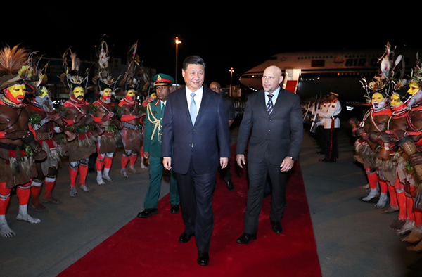 当地时间晚8时05分许,习近平乘坐的专机抵达莫尔兹比港杰克逊国际机场。习近平步出舱门,现场响起热烈的掌声,巴布亚新几内亚副总理埃布尔率政府高级官员在舷梯旁热情迎接。巴布亚新几内亚少年向习近平献上鲜花。红地毯两侧,英姿飒爽的礼兵昂首伫立。当地舞蹈演员头戴羽饰,腰系草裙,手持皮鼓,跳起热情洋溢的迎宾舞蹈。机场外,自发赶来的当地民众、中资企业员工和华侨华人簇拥在机场外和中国代表团下榻处,挥舞着中国国旗,热烈欢迎习近平。