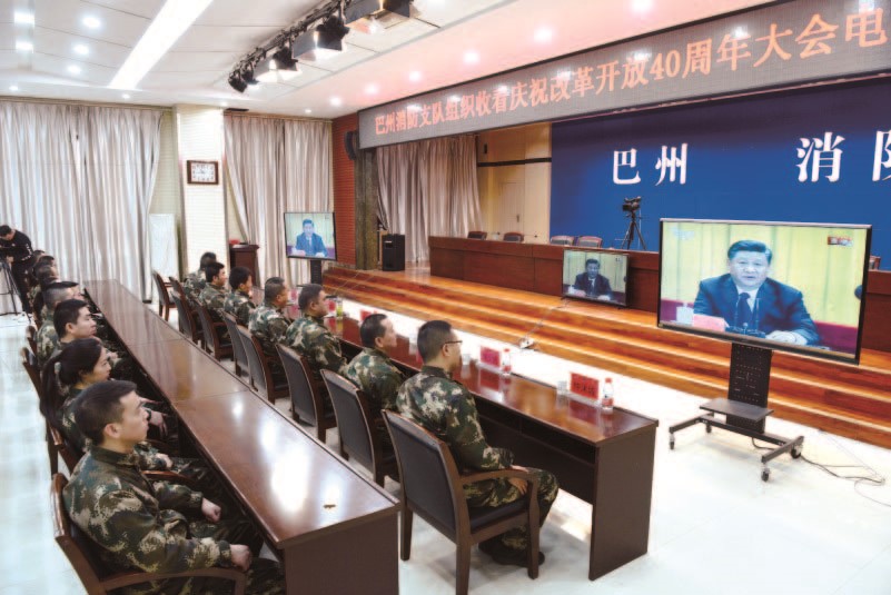 昨日上午10时,我州400余名消防指战员在各自分会场同步收看庆祝改革开放40周年大会直播。 本报记者 杨坤 摄