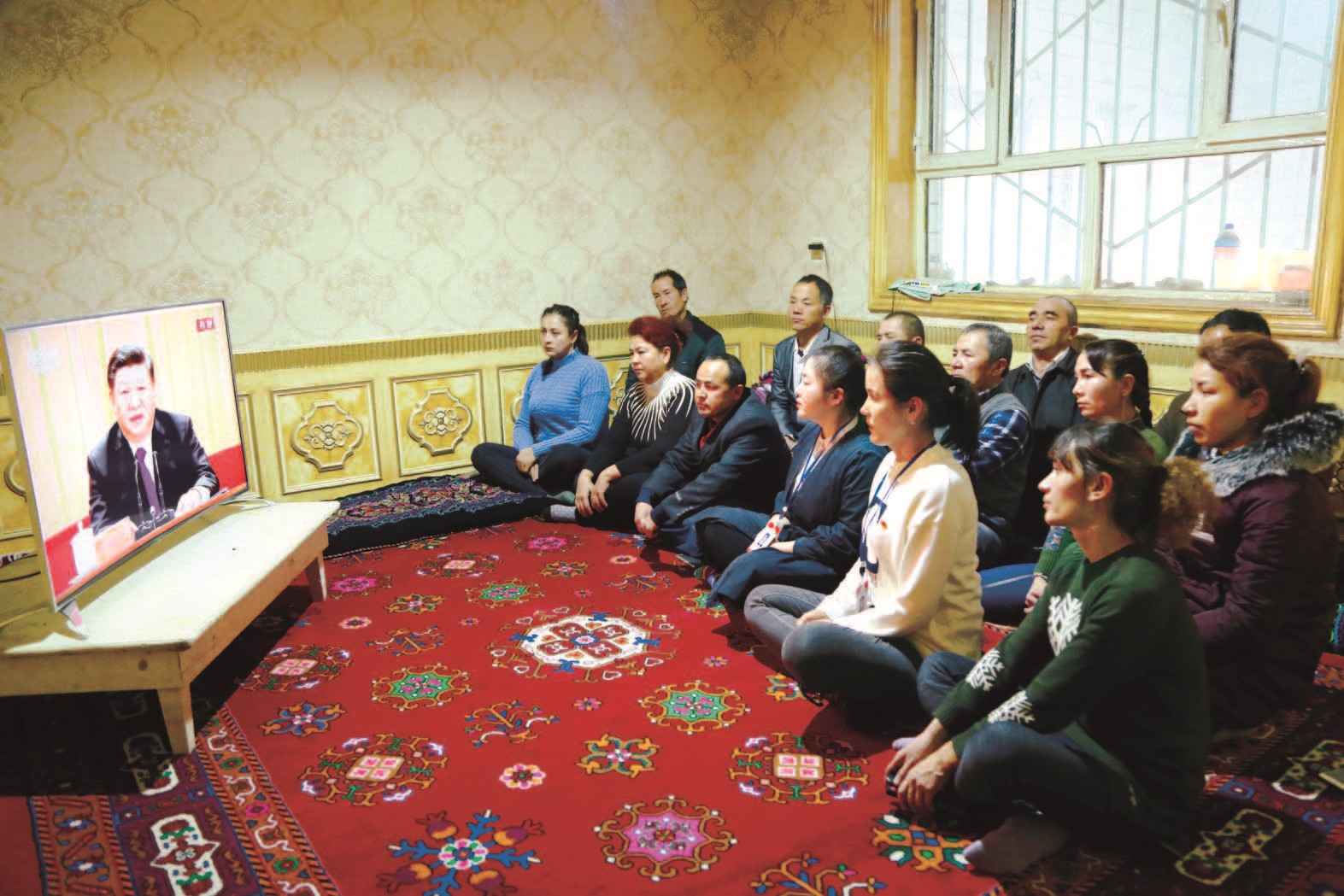12月18日,和硕县妇幼保健计生服务中心驻塔哈其镇阿尔文德尔文村工作队员在村民吐生江·卡德家一起观看庆祝改革开放40周年大会直播。 通讯员 贾洪明 摄
