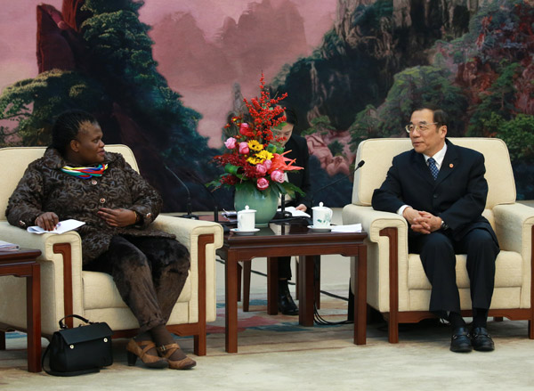 中共中央政治局委员、中央纪委副书记杨晓渡11月21日在人民大会堂会见南非公职与行政事务部部长穆坦比。(中央纪委监察部网站 徐梦龙 摄)