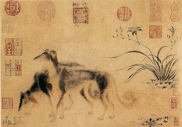 萱草入画,始于唐末五代。据宣和画谱记载,晚唐画家刁光曾绘《萱草百合图》,这大约是史载最早的一副萱草图了。从画作名称看,应该是祝愿婚姻美满、子孙昌盛。而后南唐梅行思绘《萱草鸡图》,五代滕昌佑作《萱草兔图》,北宋赵昌画《萱草榴花图》。上面的这幅《萱花双犬图》是明宣宗朱瞻基的作品,绘于宣德丁未年。当时宫中贵妃有孕,画中双犬相伴相依,恩爱融洽,婀娜的萱花反映出宣宗求子心切。