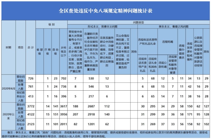 2020年6月,全区查处违反中央八项规定精神问题726件,处理761人,其中查处形式主义、官僚主义问题549件,查处享乐主义、奢靡之风问题177件;给予党纪政务处分413人,其中地厅级1人、县处级16人、乡科级及以下396人。